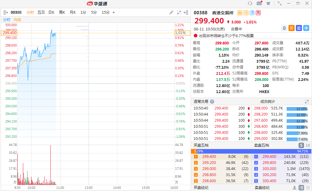 新浪港股讯 6月11日消息,网易今日在香港上市,香港交易所盘中股价以299.6港元再创新高,市值逼近4000亿港元。截至发稿,港交所涨1.01%,报299.4港元。