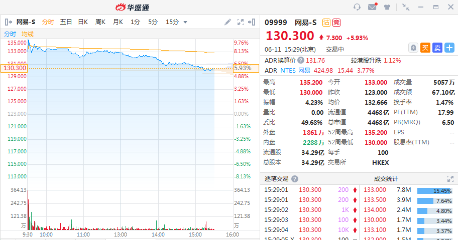 今日(6月11日)9点半,网易正式在香港交易所挂牌上市,敲响了2020中概股回港潮的第一记“锣”声,这也是丁磊的又一次敲钟仪式。133港元的开盘价,较发行价123港元上涨逾8%,参与网易打新的投资者,一手大约能赚1000港元。