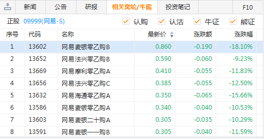 网易作为大型热门股,衍生工具自然少不了。港交所此前就公告,网易上市同日即可推出相关期货及期权,相关衍生权证也可于今日同步挂牌,同时沽空交易也可支持。