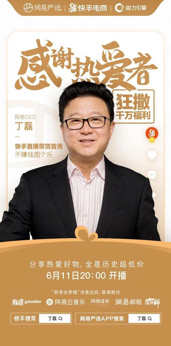除了上市敲钟,丁磊还马不停蹄地开启 “带货”模式,今晚8点,他还要在快手直播,为网易全家桶带货。