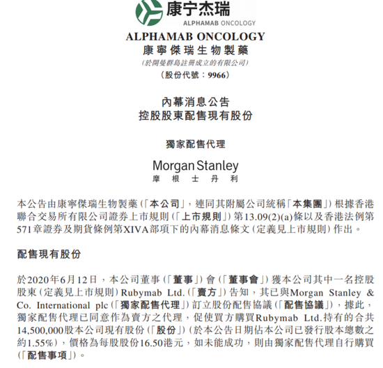 新浪港股讯 6月12日消息,康宁杰瑞制药-B(09966)发布公告,卖方Rubymab Ltd.与配售代理Morgan Stanley & Co. International plc订立股份配售协议,配售代理已同意作为卖方的代理,促使买方购买Rubymab Ltd.持有的合共1450万股公司现有股份,于本公告日期占公司已发行股本总数约1.55%,价格为每股16.5港元(较昨日收盘价折让4.1%),如未能成功,则由配售代理自行购买。