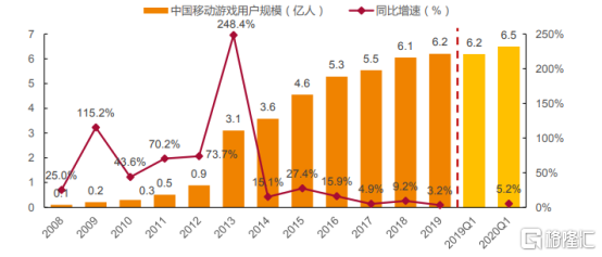 2008-2020年第一季度中国移动游戏用户规模及同比增速