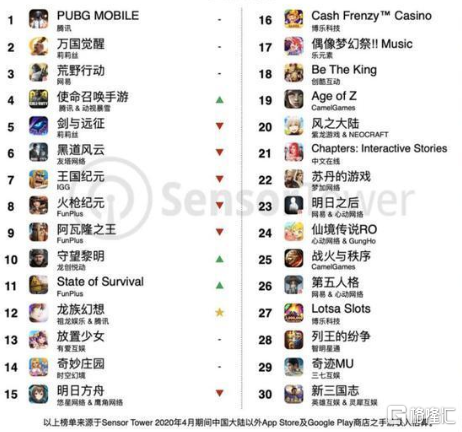 2020年4月中国手游收入TOP30(海外App Store+Google Play)