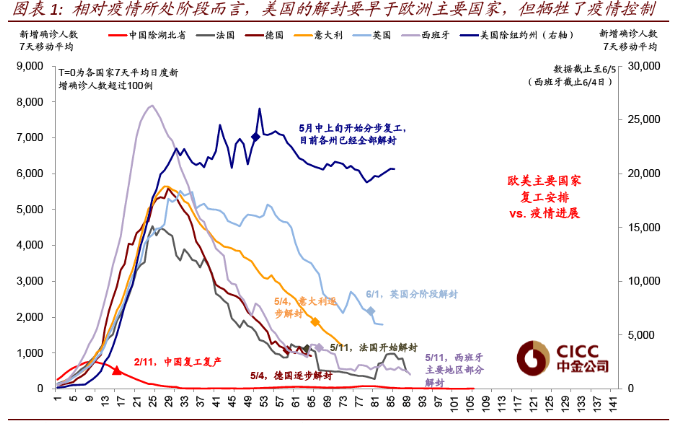 如果想要理解市场,那么疫情就成为了主要应该关注的内容。自5月中上旬开启逐步复工以来,到目前为止,美国基本所有州都已经解封,差异仅在于解封程度不同。相对其疫情所处阶段而言,美国的解封要快于欧洲主要国家,也就导致其牺牲了一部分疫情的控制效果。英国直到6月1日才解封,比美国晚了2~3周,此时其疫情“曲线”已明显处于下行通道,而美国正是因为早解封了2~3周,故到目前为止,除纽约州外依然没有有效下行,仍在高位徘徊。