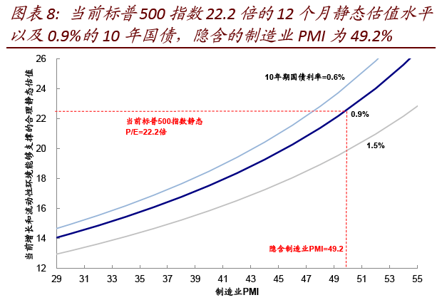 整体市场角度,标普500指数下跌前约22.2倍的12个月静态估值水平以及0.9%的10年国债利率,隐含的制造业PMI为49.2%,较5月份43.1%的制造业PMI有明显回升。这一PMI,如果叠加其与企业盈利增长的较高的相关性,对应12个月动态EPS回升至-1.5%左右 vs. 当前的-18.4%。