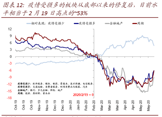 板块层面,如果以疫情受损多的板块如交通运输、消费者服务、耐用消费品与服装、汽车等从底部以来的相对修复程度作为计入复工预期的近期替代的话,目前水平相当于2月19日高点的~53%。