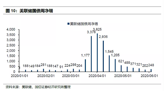 美联储的国债购买,由单周高峰的3600亿,下降至目前的200亿美元。