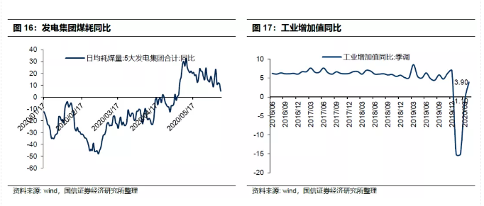 以高频数据发电煤耗同比为例,5月经历了一拨快速的恢复,于6月份同比则明显转弱,但依然显著在零轴之上,这可能是由于4/5月份企业复工消化了疫情真空期的需求,而5月下旬6月上旬则转入常态。故而,预计5月份的工业增加值同比继续向上,但6月份估计无法突破疫情之前的水平(12月份6.9)。