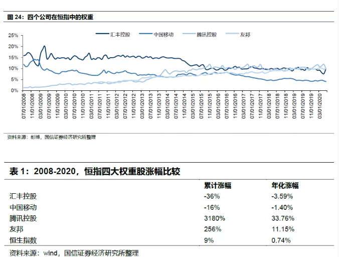 本月,京东与网易将在港股IPO。回顾08年至今,港股的权重股的变化,很大程度上是腾讯的加入使得港股变得更加有吸引力。腾讯的权重从08年的1.3%,上升至2020年的11%,汇丰控股,中国移动,则从2008年的16%,11%,下跌至当下的10%和4%。