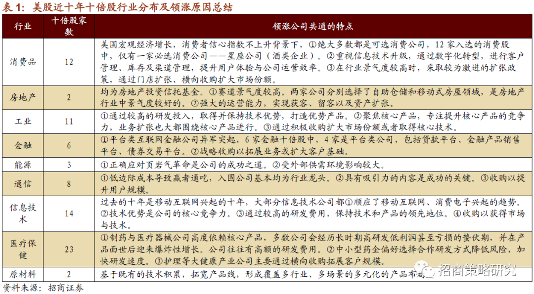 根据筛选,在2010年至2019年间美股股价上涨超过10倍并且2019年底市值大于10亿美元的公司有81家。而其中有14家都是信息技术行业,也就是科技行业。