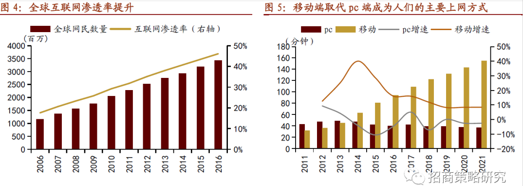 首先在硬件方面,智能手机的飞速发展带动上网用户数量快速增长,移动端取代PC端成为人们上网的主要方式,移动互联网迎来流量爆发。截至2016年年底,全球互联网渗透率已达46.1%,相比于十年前提高了28.5%。换句话说,全球接近一半的人口已经迈入互联网的世界。