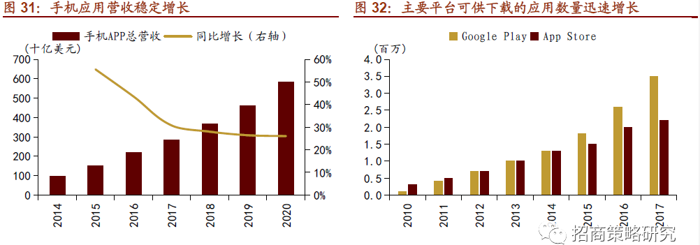 全球手机APP营收(包含应用内广告收入和应用下载收入)在2014-2018年增速维持在30%以上,至2018年已达3652亿美元。数量方面,2017年,手机应用下载平台的应用数量已超570万个,相比2010年增长130.25%。