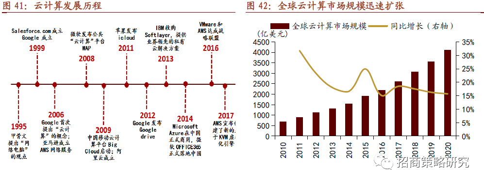 第三是云计算,早在2006年亚马逊、Google和IBM相继提出了云计算的概念。也是这一年,亚马逊AWS公开发布S3存储服务、SQS消息队列及EC2虚拟机服务,正式宣告了云计算的到来。此后,谷歌、微软、IBM、Oracle相继推出自己的云平台,云计算开始兴起。