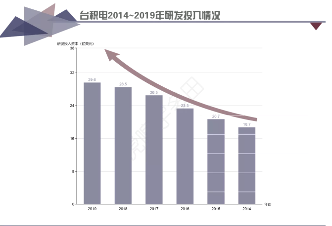过去 5 年里,台积电每年的资本支出总额都在 130 亿~150 亿美元之间,2019年更是达到创记录的149亿美元;同时,作为台湾地区研发投入最大的企业,台积电研发投入占总收入比重每年都在 8%左右,基本保持在 20 亿~30 亿美元。