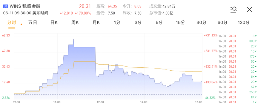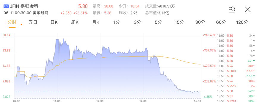 其中,嘉银金科单日涨幅最高达到916%,相当于一天9倍!而收盘却大幅回落至96.6%的涨幅,股价也从最高点的近30美元跌到5.8美元。稳盛金融盘中也一度涨776.81%,但临近收盘也大幅回落,最终收涨170%。