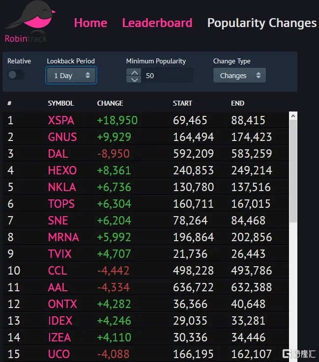 Robinhood当天最热门交易股票,图片来自Robintrack网站