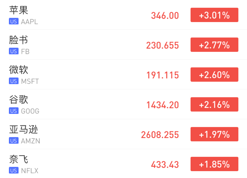 截止发稿,苹果涨超3%,谷歌、微软、Facebook均涨超2%。亚马逊和奈飞也涨近2%。