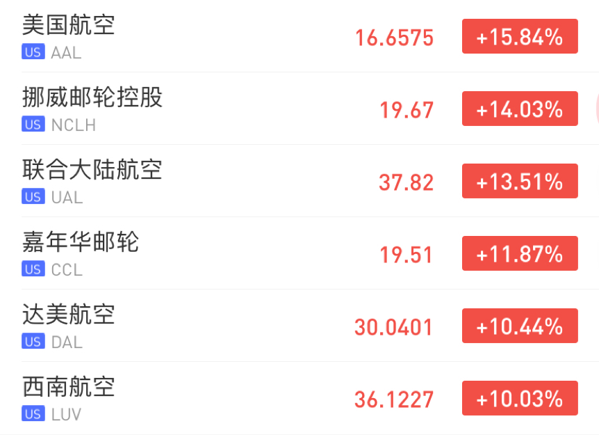 此外,前段时间历经大幅回调的邮轮及航空板块也涨势如虹。截至发稿,美国航空涨近16%,挪威邮轮控股涨超14%,达美航空、西南航空均涨超10%。