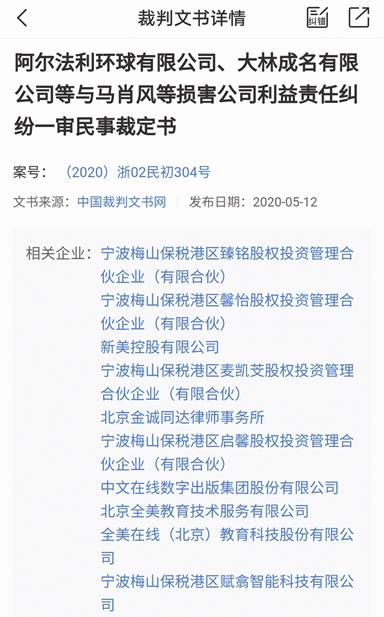 值得注意的是,上述公告还显示,被告还有马肖风、宁波梅山保税港区麦凯芠股权投资管理合伙企业(有限合伙)(以下简称“宁波麦凯芠”)、宁波梅山保税港区启馨股权投资管理合伙企业(有限合伙)(以下简称“宁波启馨”)、宁波梅山保税港区臻铭股权投资管理合伙企业(有限合伙)(以下简称“宁波臻铭”)、宁波梅山保税港区馨怡股权投资管理合伙企业(有限合伙)(以下简称“宁波馨怡”)、新美控股有限公司(以下简称“新美公司”)、童之磊、北京全美教育技术服务有限公司(以下简称“全美教育”)等一系列个人和企业。