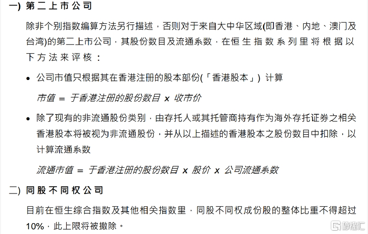此外,针对第二上市公司,除非个别指数编算方法另行描述,否则对于来自大中华区域(即香港、内地、澳门及台湾)的第二上市公司,其股份数目及流通系数在恒生指数系列里将按公司市值只根据其在香港注册的股本部份计算;除了现有的非流通股份类别,由存托人或其托管商持有作为海外存托证券之相关香港股本将被视为非流通股份,并从以上描述的香港股本之股份数目中扣除,以计算流通系数。