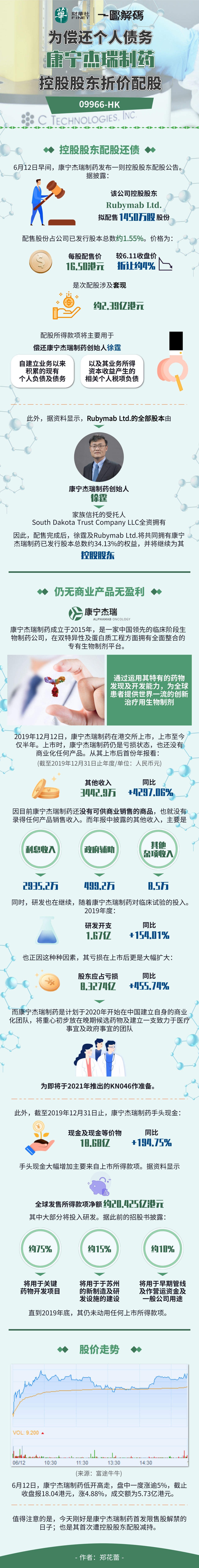 6月12日早间,康宁杰瑞制药(09966-HK)公布,公司其中一名控股股东Rubymab Ltd.拟配售1450万股公司现有股份,占已发行股本约1.55%;每股配售价16.50港元,涉及套现约2.39亿港元。经卖方确认,配售事项所得款项将主要用于偿还康宁杰瑞制药创始人徐霆自建立业务以来积累的现有个人负债及债务以及其业务所得资本收益产生的相关个人税项负债。