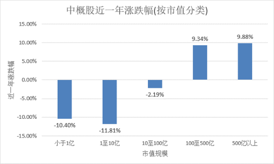 从中概股近一年的涨跌情况可以看出:市值超过100亿的公司平均涨幅超9%,而市值低于10亿的公司平均下跌超10%。从行业板块来看,公用事业和工业板块有正收益,而材料、电信服务、房地产、能源等板块跌幅超20%。这些说明中概股的表现存在明显的市值效应和行业板块效应。