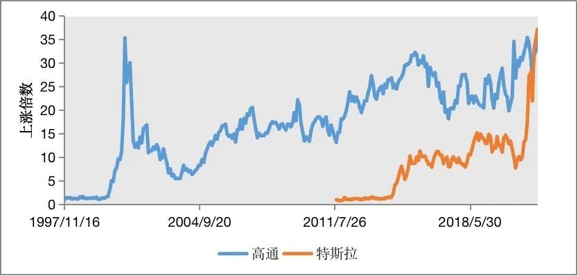 图2 高通和特斯拉过去二十三年中的股价