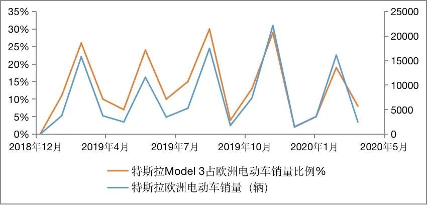 图5 特斯拉占欧洲电动汽车销售比例及特斯拉在欧洲Model 3的销量
