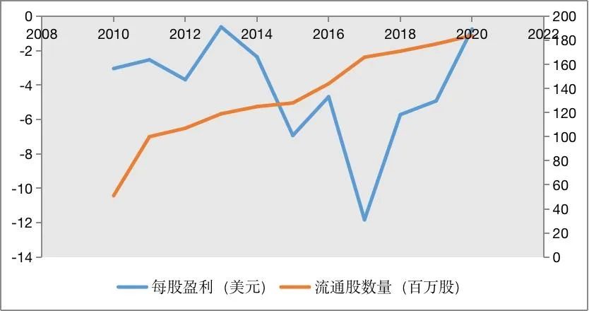 图3 特斯拉过去十年的每股盈利以及流通股数