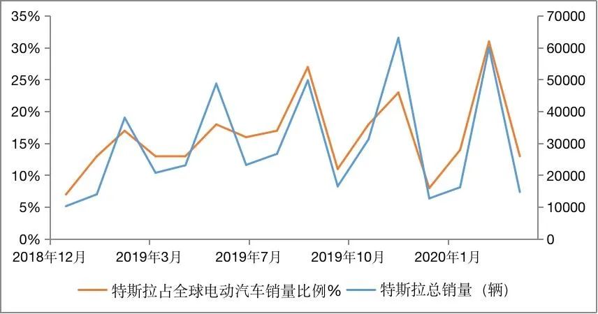 图4 特斯拉占全球电动汽车销售比例及特斯拉总销量
