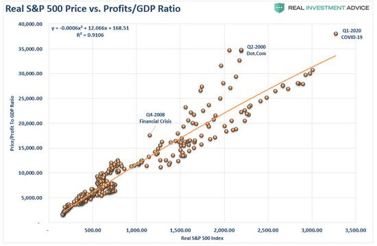 你不应该否认市场偏离了长期收益的事实。从历史上看,这种偏离并不适合过度“看多”的投资者。当观察市场与企业利润占GDP的比率时,这种相关性更为明显。