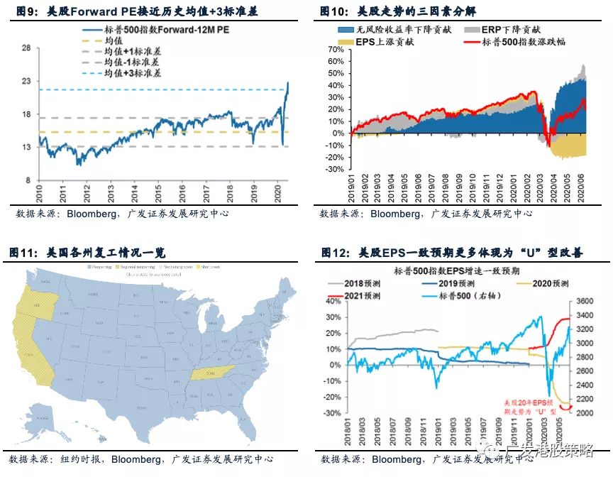 总体来看,FOMC的表态未改变流动性宽松的大局,极高估值的美股仍沉浸在‘宽松依赖症’的幻觉中,最新美股Forward PE超过21倍,接近2010年以来均值+3标准差。我们认为,短期内‘无底线量化宽松’+财政刺激+复工带动的估值反弹过程并没有彻底逆转。