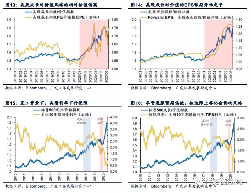 尽管我们认为后续美股可能波动性逐渐增加,甚至不排除出现节奏偏稳但持续较长的调整(参考报告《美股从暴跌暴涨到‘绵绵细雨’》,2020-4-19);但美股价值相对成长跑赢的格局可能仍会持续,关键的支撑逻辑在于‘基本面预期和相对估值的背离’,即美股成长对价值的盈利预期开始趋稳甚至走弱,但成长对价值的相对估值仍顶在历史高位。即使波动率增加,投资者也可能基于基本面与估值匹配的维度转向配置价值股。