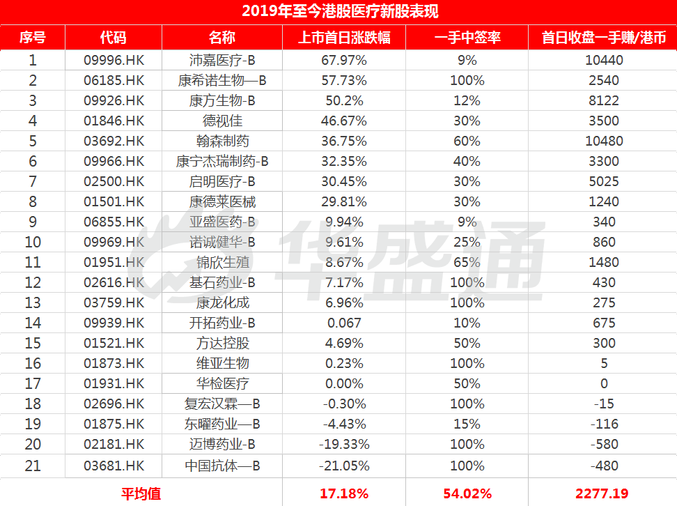 这与医药新股的表现不无关系,2019年以来上市了21只新股中16只首日大涨,平均首日涨幅高达17.18%,平均中签率超过54%,首日平均一手赚2277港元,明显高于其他板块平均表现。