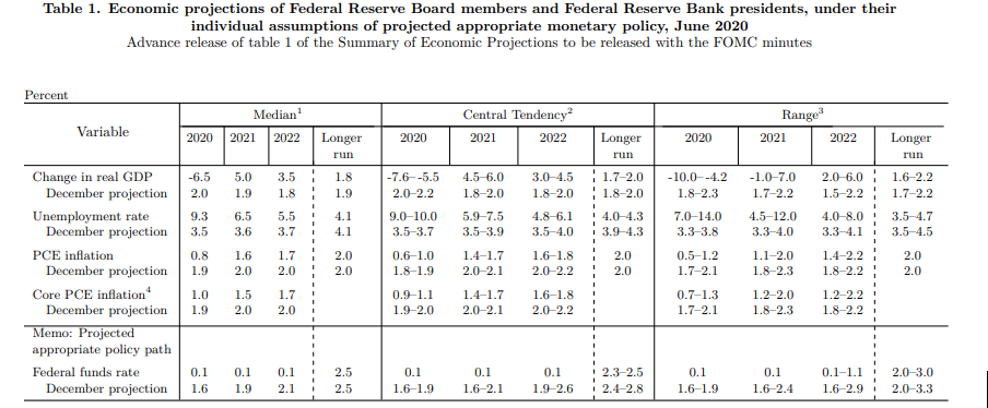 因疫情推迟更新的经济预测报告(SEP)显示,今年四季度美国平均失业率回落至9.3%,2020年全年美国经济将萎缩6.5%,明年将反弹5%。美联储最新公布的半年度货币政策报告中亦指出,复苏的步伐最终将取决于美国和国外疫情的演变以及为遏制疫情而采取的措施。