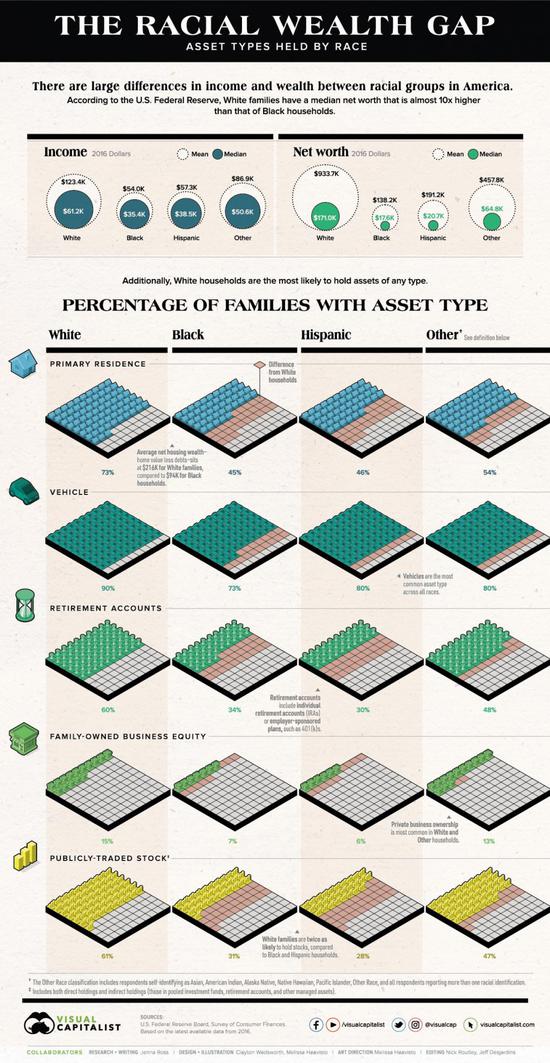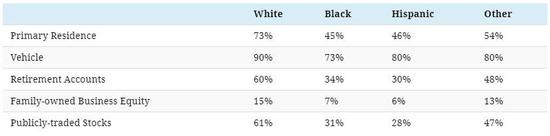 不同种族之间的经济状况差别很大。根据2016年的最新调查,以下是拥有各类资产的美国家庭的百分比。