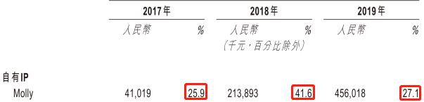 小浣熊的成功经验启发我们,“收集”对于公司运营来说是一个值得深入挖掘的机会,一个产品如果具备收集的属性,复购率就会很高,无论时间还是金钱方面都可以大大提升单个用户的总付出。2015年,尚在经营日式百货零售店的泡泡玛特发现日本潮流玩具SonnyAngel全年卖了大约3000万,这让当时全年营收4537万的泡泡玛特果断转向潮玩IP运营,并于2016年签下香港潮玩设计师王信明,成为后者设计的Molly系列潮玩在大陆的独家代理。招股书显示,Molly发挥非常稳定,一直是公司销售占比最高的IP。
