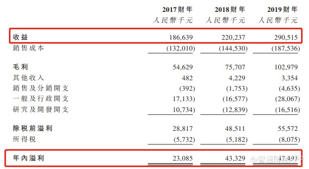 2017财年至2019财年,集团的收益分别约为人民币1.866亿元、2.202亿元、及2.905亿元;净利润分别为2310万元、4330万元、及4750万元。