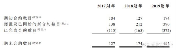 公开文件显示,集团的大部分项目均通过招标获取。截至2019年12月31日止年度,招标成功率超过60%。2017财年至2019财年合约数量变化情况如下: