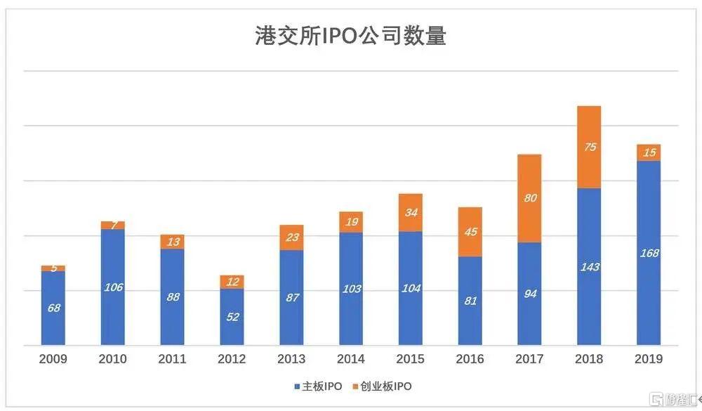 2019年,IPO数达183家,主板、创业板分别为168家、15家,主板IPO占比超过90%。15宗创业板IPO统共融资9700万港元,占港交所全体公司募集资金总额的0.2%,可以忽略不计。