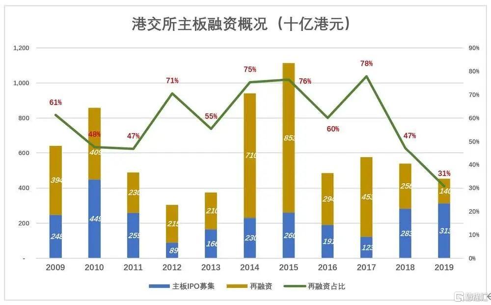 2017年IPO总数回升到174家,但融资规模偏小的创业板公司占据80席。这一年,再融资占港交所募集资金总额的78%,IPO募集资金仅占22%。