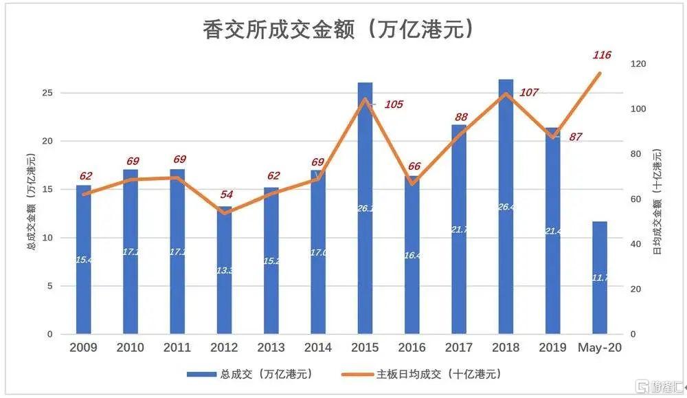 2018年港交所成交金额达到26.4万亿,主板日成交创历史新高、达到1070亿。2020年前5个月,港交所总成交金额达11.7万亿,日均成交再创新高、达1160亿港元。