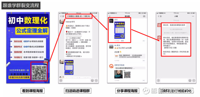 GSX原来做O2O的时候,让几十万的老师把自己的学生都带到线上,GSX因此积累了一批家长的微信和手机号,并且积累了有几千个微信群(家长群),后来GSX利用这批初始资源进行Q群和微信群的裂变传播,使得GSX前期的获客成本非常低。