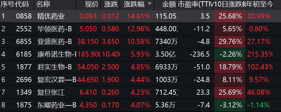 医药股多数走高,其中,精优药业涨近15%,华领医药涨近13%,亚盛医药、康希诺、君实生物等集体大涨。