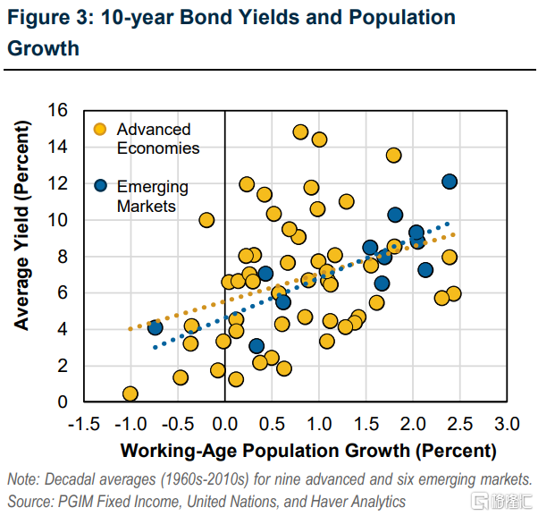 值得注意的是,人口老龄化与实际GDP增长放缓和通胀降低有关。此外,如图3所示,较慢的劳动年龄人口增长也与较低的长期名义债券收益率相关,这可能反映出经济疲软,特别是通胀和通胀预期的降低。