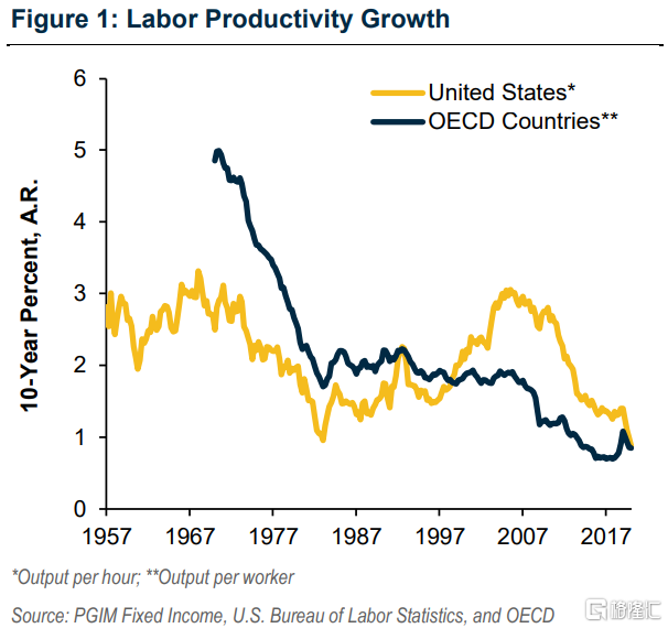 第三,更具推测性的是,这种部门再平衡可能会带来生产率增长的复苏。近年来,智能手机、加速的计算能力、大数据、人工智能、基因组学、脑科学等令人印象深刻的技术层出不穷。然而,过去十年的生产率增长是战后最慢的。如图1所示,不仅在美国如此,在其他经合组织国家也是如此。