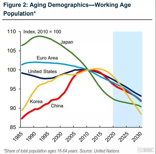 第五,深刻的人口趋势将继续影响全球经济表现。如图2所示,未来10年,发达经济体的劳动年龄人口(16-64岁)增长率将放缓或萎缩,在新兴市场中,中国和韩国也将感受到收缩。许多其他新兴经济体的增长速度也将低于过去几十年。