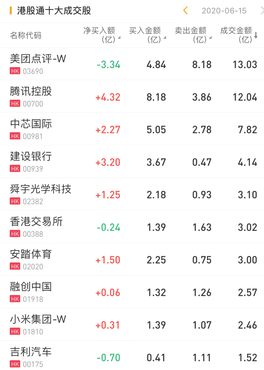 今日,南下资金净买入腾讯控股4.32亿港元,净买入建设银行3.20亿港元,净买入中芯国际2.27亿港元,净买入舜宇光学科技1.25亿港元。此外,南下资金今日净卖出美团点评3.34亿港元。