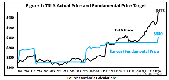 对比 478 美元的真实价格,特斯拉在 2019 年第四季度股价大概被高估了 36%。