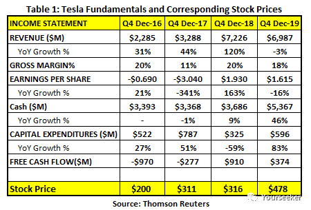 这里不具体建模来测算当前特斯拉公允的基本价值。但是结合特斯拉实际股价以及它 2016-2019 年四个第四季度的财务指标,我们可以得出一个有意思的观察。